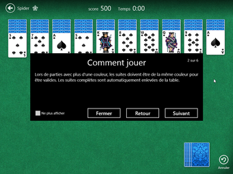 Dans la version Spider, vous commencez la partie avec huit colonnes de cartes que vous devez effacer avec le moins de coups possible. Commencez par jouer avec une seule couleur jusqu'à ce que vous soyez à l'aise, puis vous pouvez compliquer le jeu en utilisant deux ou même les quatre couleurs dans une partie.